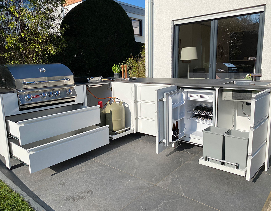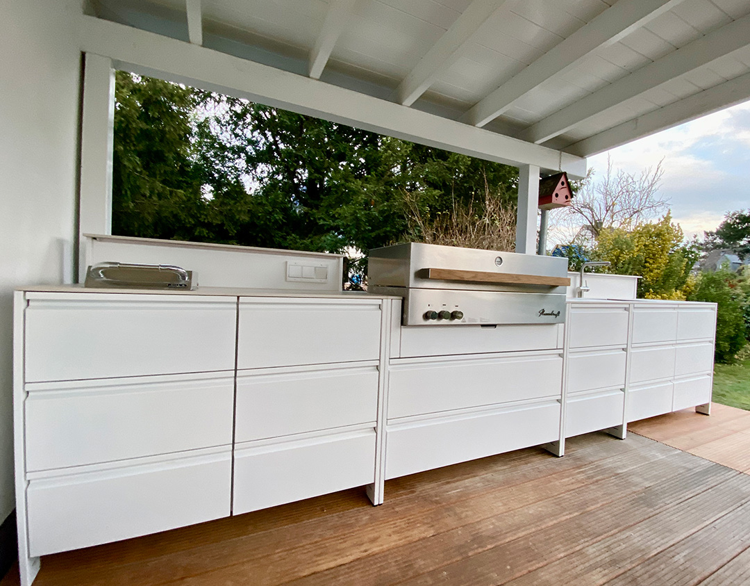 Sie suchen eine Outdoor-Küche, die gleichzeitig funktional wie Design-Objekt ist? Belmento produziert Außenküchen, die den modernen, wertigen Style Ihres Interieurs nach draußen holt, ohne Kompromisse zu machen. Die Außenfronten aus lackiertem Metall weisen dabei ein einzigartiges Design auf: Die Fronten bestechen durch einheitliche Optik – als würden drei Schubkästen übereinander liegen – selbst wenn es sich dabei eigentlich um eine Tür für praktischen Stauraum, Müllbehälter oder Gasflaschen handelt. So machen Sie optisch keine Abstriche und haben die volle Funktionalität einer Outdoor-Grillküche.